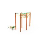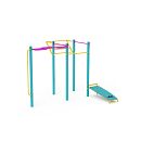 Menšia zostava s viacerými horizontálnymi hrazdami rôznej výšky, multi segmentovou hrazdou a lavičkou ľah - sed je doplnená naklonenou rebrinou a vertikálnou hrazdou - human flag.