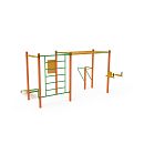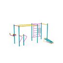 Menšia zostava s hrazdou, horizontálnym a vertikálnym rebríkom, bradlami a posilňovacou lavičkou ľah-sed a posilňovačom brušných svalov.