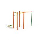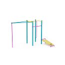Menšia zostava s viacerými horizontálnymi hrazdami rôznej výšky, vertikálnou hrazdou a lavičkou ľah - sed, pole dance tyčou a multi úchopovou hrazdou.