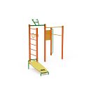 Menšia zostava s viacerými horizontálnymi hrazdami rôznej výšky, vertikálnym rebríkom, vertikálnou hrazdou, kruhmi a lavičkou ľah - sed.