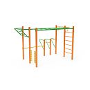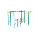 Stredne veľká zostava s viacerými horizontálnymi hrazdami, bradlami, horizontálnym rebríkom je doplnená naklonenou rebrinou a pole dance tyčou.