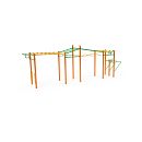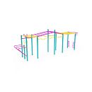 Veľká zostava s horizontálnymi hrazdami rôznych konfigurácií, bradlami a horizontálnymi rebríkmi je doplnená kruhmi a rebrinou na kliky.