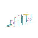 Veľká zostava s horizontálnymi hrazdami rôznych výšok, vertikálnymi hrazdami, bradlami, horizontálnym rebríkom je doplnená hrazdou s guľami, multi úchopovou hrazdou a lavičkou ľah-sed.